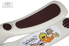 Особое внимание уделено безопасности. Ножной тормоз на заднем колесе позволяет быстро и эффективно остановить самокат в случае необходимости. Прорезиненный пластик сиденья, которое можно снять, отрегулировать по высоте и вращать, обеспечивает дополнительный комфорт во время поездок. Противоскользящее покрытие деки предотвращает соскальзывание ноги, повышая безопасность.
