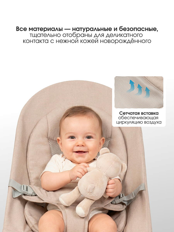 Безопасность обеспечивает прочная устойчивая конструкция, поясной ремень и мягкий разделитель для ножек, который не даёт малышу соскользнуть или перекрутиться. Шезлонг рассчитан на детей до 9 кг — идеальное решение на первые месяцы жизни.