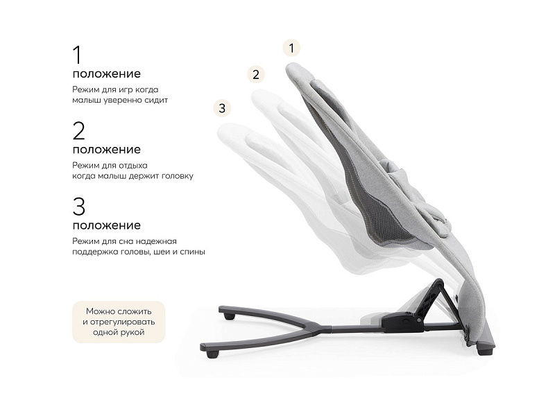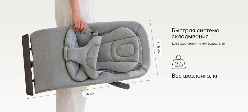 Детский шезлонг поможет мамам заниматься необходимыми делами и всегда быть рядом с новорождённым. Устройте себе перерыв, пока малыш изучает мир за пределами кроватки, покачиваясь в уютном сиденье. Будьте уверены, что младенец находится в анатомически правильном положении. Устойчивая конструкция снабжена мягким разделителем для ног и надёжными ремнями на фастексах для безопасности. У эргономичного кресла 3 варианта наклона, что позволяет учитывать режим дня и настроение крохи. Каркас изготовлен из лёгкого и прочного алюминия, благодаря чему шезлонг удобно переносить по дому. Устройство компактно в сложенном виде: то, что нужно для хранения и путешествий. Раскладывается одной рукой, пока во второй вы держите малыша: достаточно поднять спинку. Приятный мягкий матрасик из нежного материала доставит малышу только приятные ощущения и поддержит его хорошее настроение. Ткань быстро отстирывается руками. Дизайн в соответствии с современными тенденциями идеально впишется в интерьер.