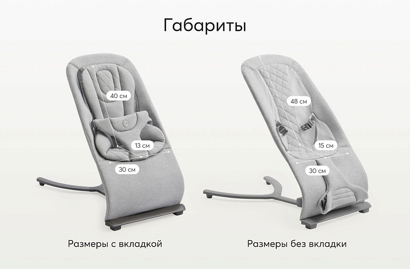• Сиденье и спинка (с вкладкой): ширина 30 см, глубина 13 см, высота спинки 40 см.• Сиденье и спинка (без вкладки): ширина 30 см, глубина 15 см, высота спинки 48 см.