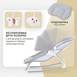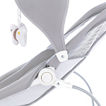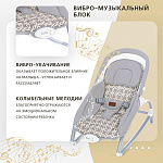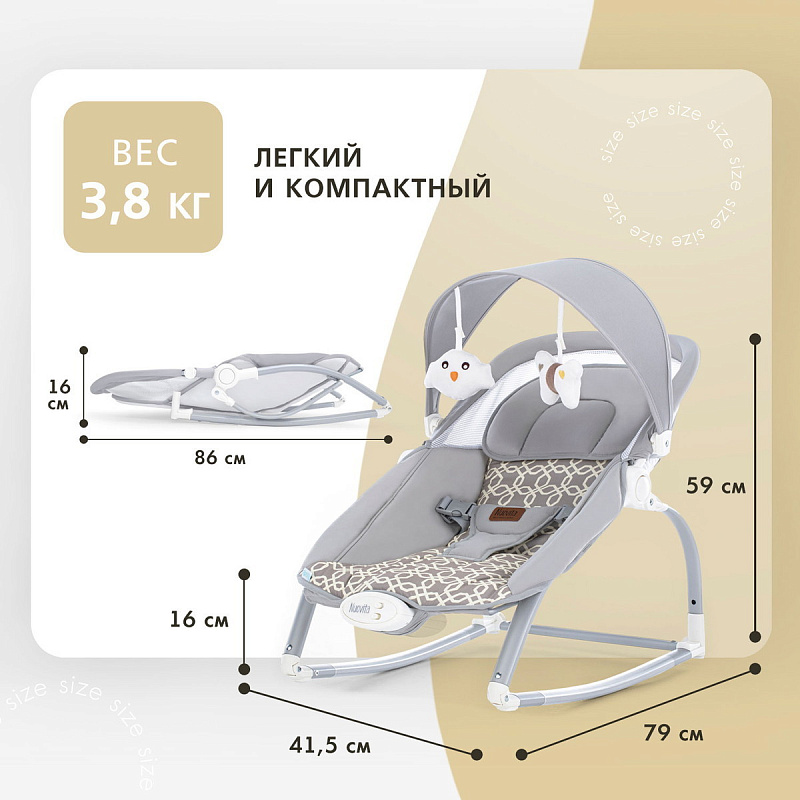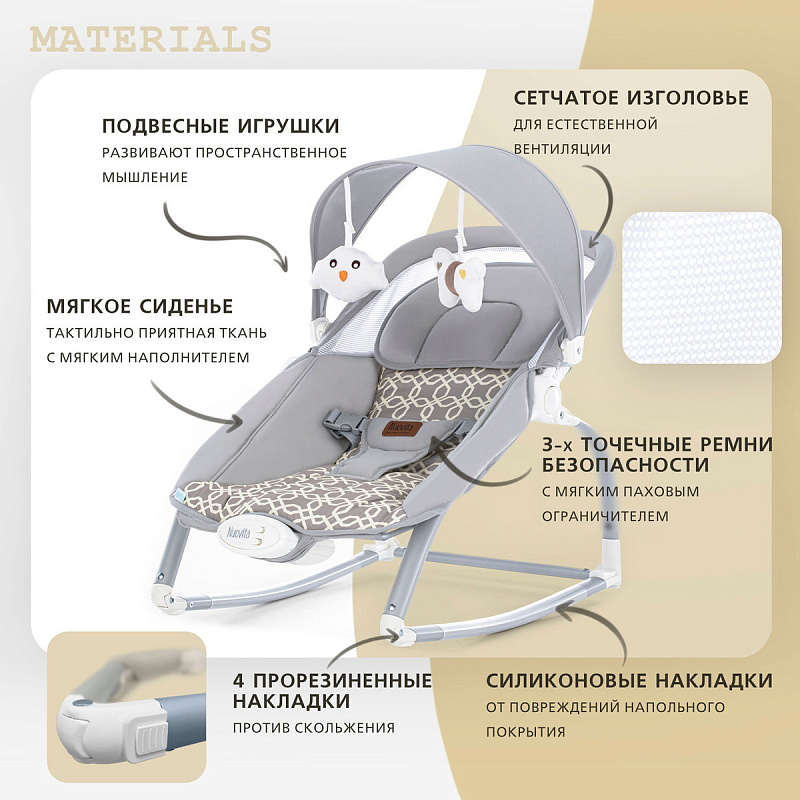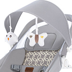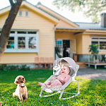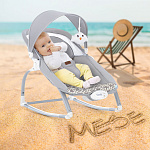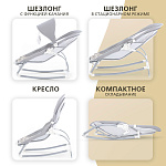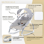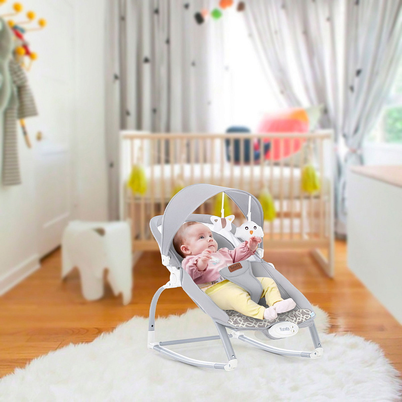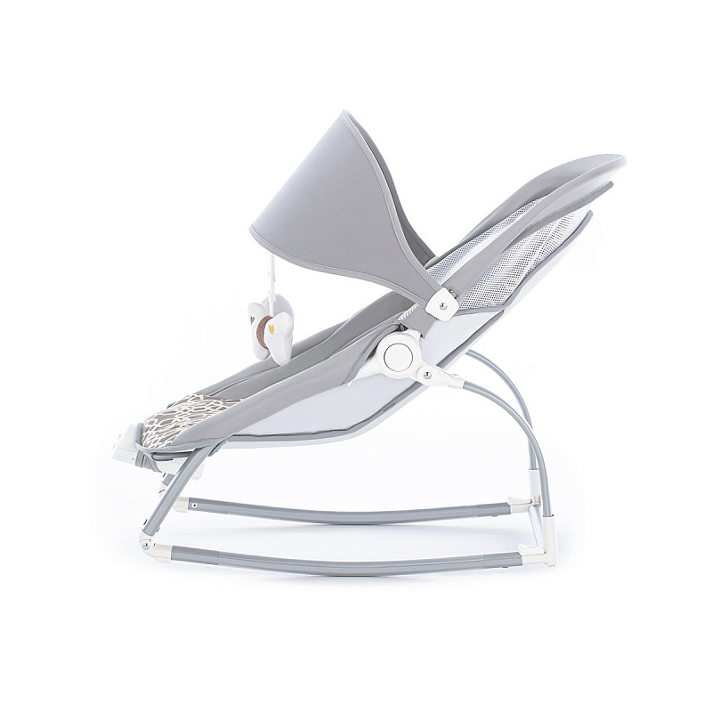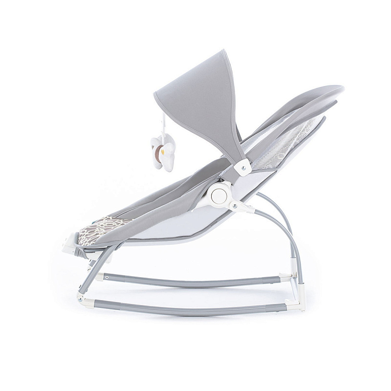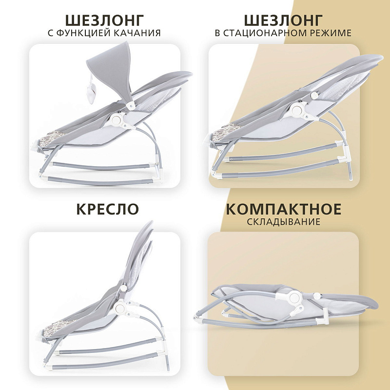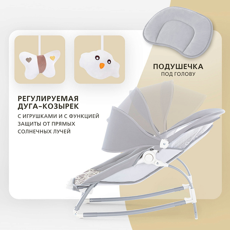 Компактный и уютный шезлонг-качалка поможет убаюкать, успокоить или развлечь малыша. На дуге-козырьке подвешены мягкие игрушки, который развивают глазные мышцы и вестибулярный аппарат. Модель небольшого размера не занимает много места в комнате. Изделие с прочным основанием можно использовать на любой ровной поверхности и даже на улице. Легко складывается для хранения и транспортировки.