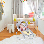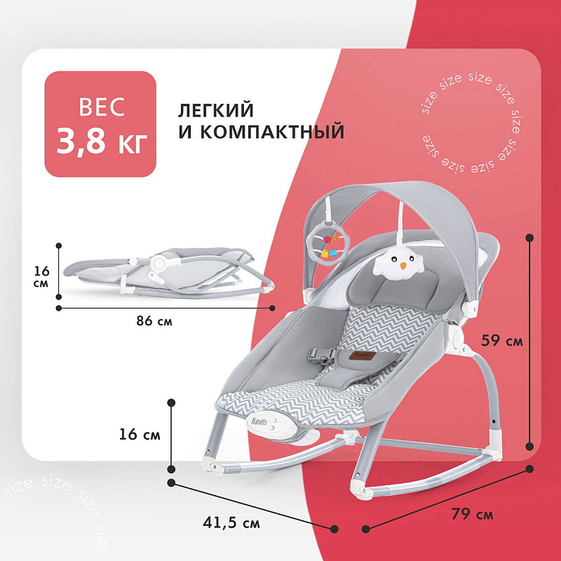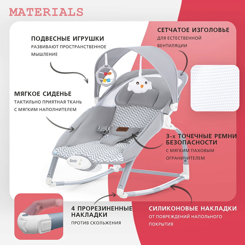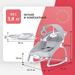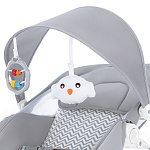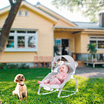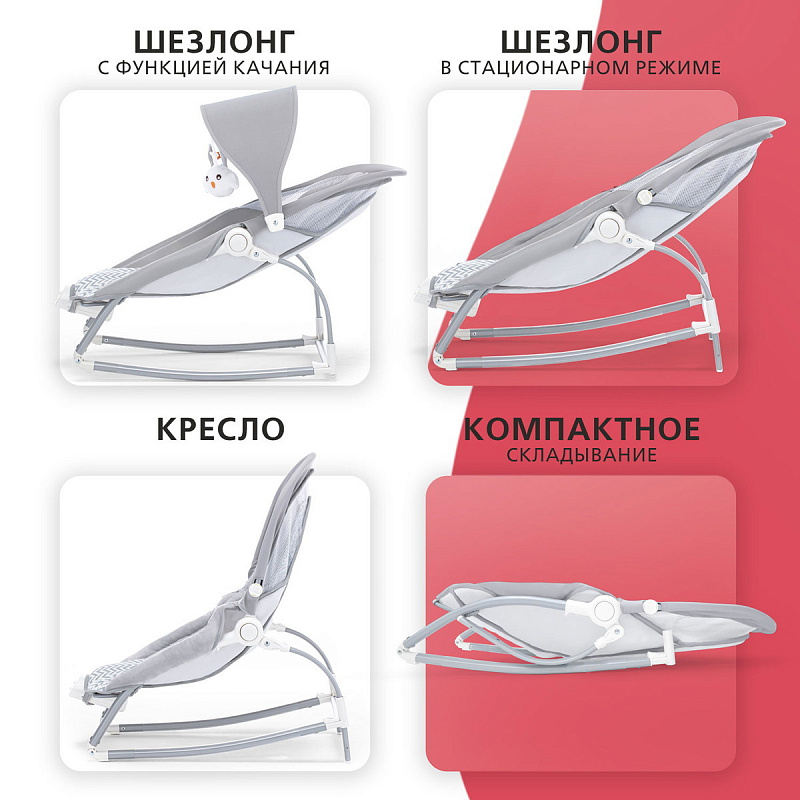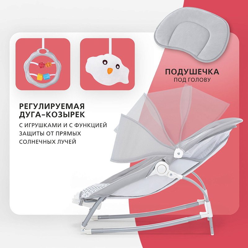 Компактный и уютный шезлонг-качалка поможет убаюкать, успокоить или развлечь малыша. На дуге-козырьке подвешены мягкие игрушки, который развивают глазные мышцы и вестибулярный аппарат. Модель небольшого размера не занимает много места в комнате. Изделие с прочным основанием можно использовать на любой ровной поверхности и даже на улице. Легко складывается для хранения и транспортировки.