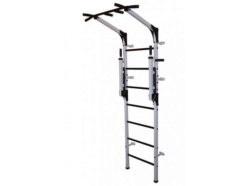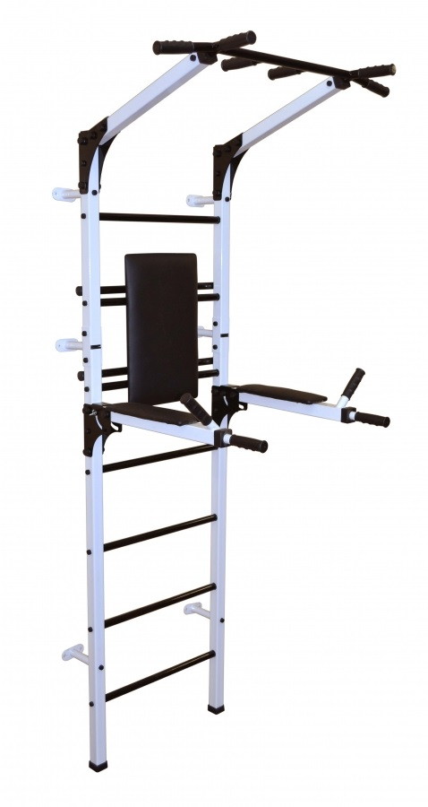 Компактный домашний спортивный комплекс для развития основных групп мышц. Оборудован турником с тремя хватами и складными брусьями с дополнительными ручками для упражнений на пресс. Для большего удобства производитель снабдил СК съемным мягким упором для спины.
