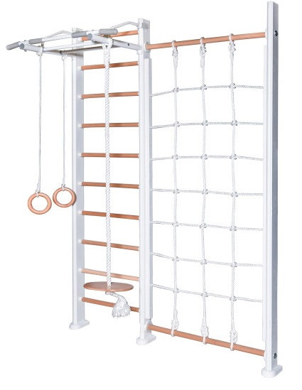 В наборешведская стенка, турник стационарный с неопреновыми ручками, кольца гимнастические деревянные, лиана, стойка с сеткой