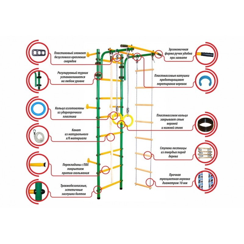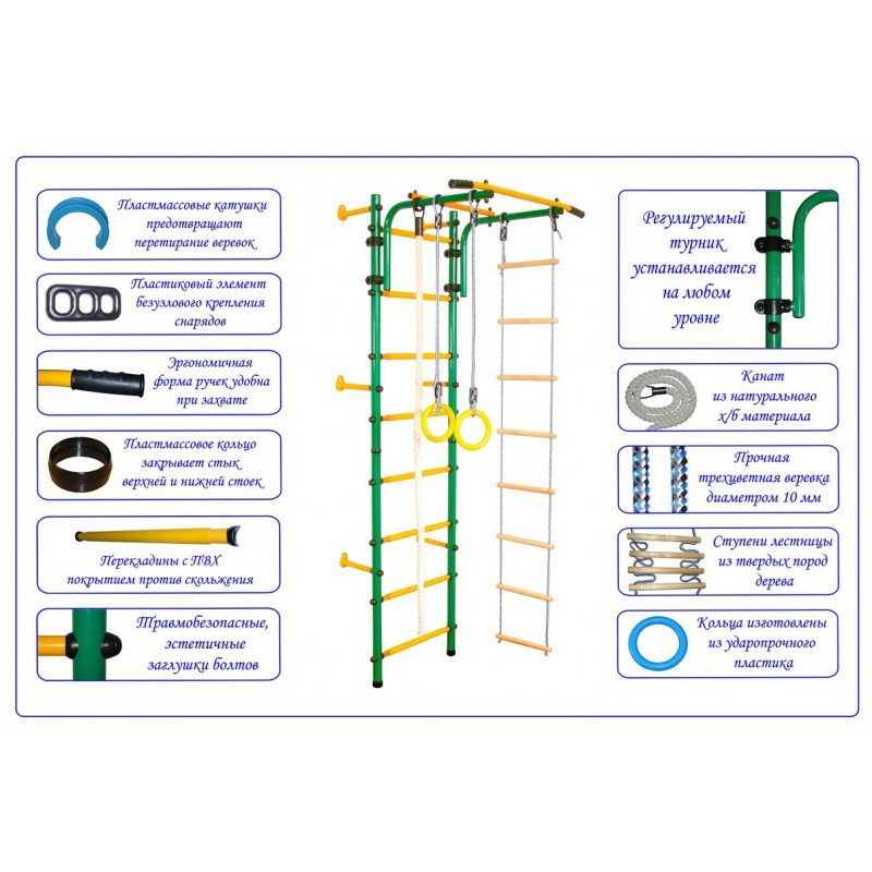 Детский спортивный комплекс предназначен для игр в квартире, при этом имеет достаточно компактный размер и не занимает много места. Занятия с комплексом способствуют развитию мыщц ребенка.