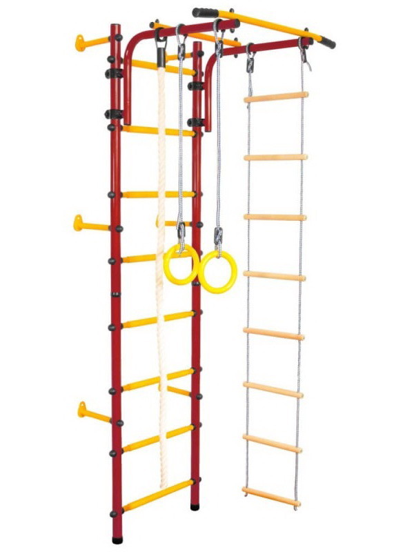 В набореШведская стенка, турник регулируемый, кольца гимнастические, веревочная лестница, канат, крепеж к стене