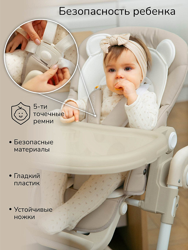 Для безопасности ребенка предусмотрены пятиточечные ремни безопасности и ограничитель между ножек, который предотвращает выскальзывание ребенка из стула.