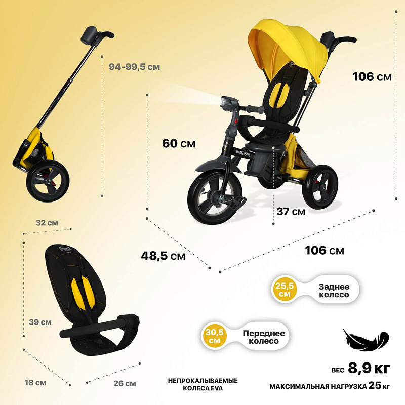 - демонтируется ручка, убирается спинка, бампер и капор (ребенок катается самостоятельно)