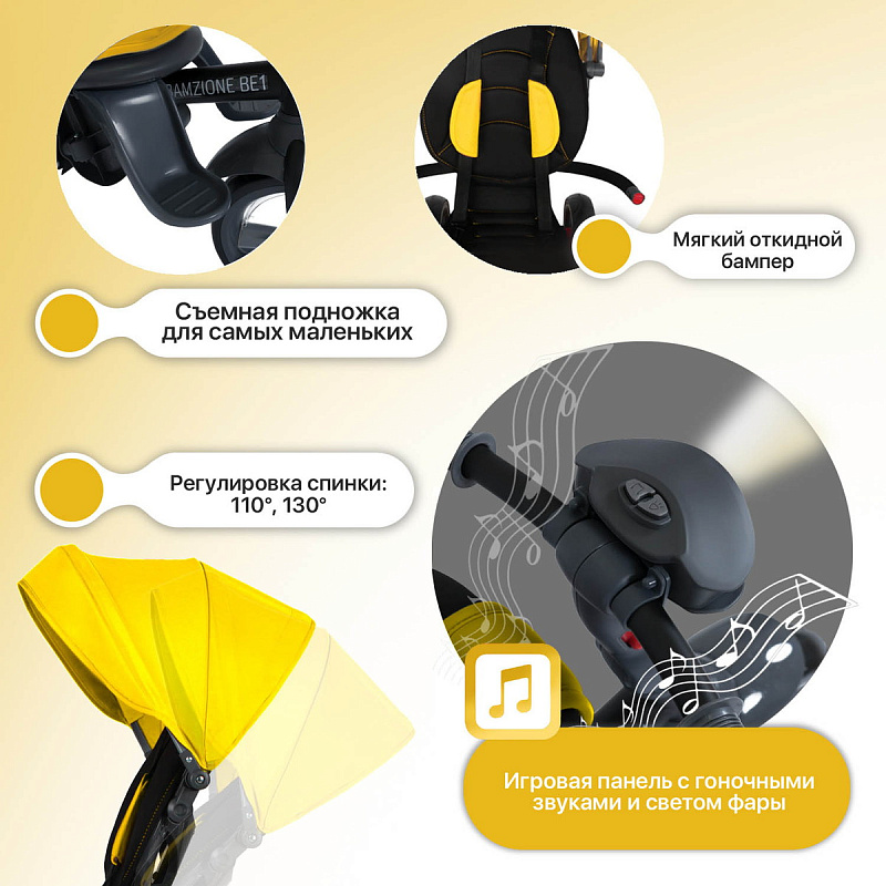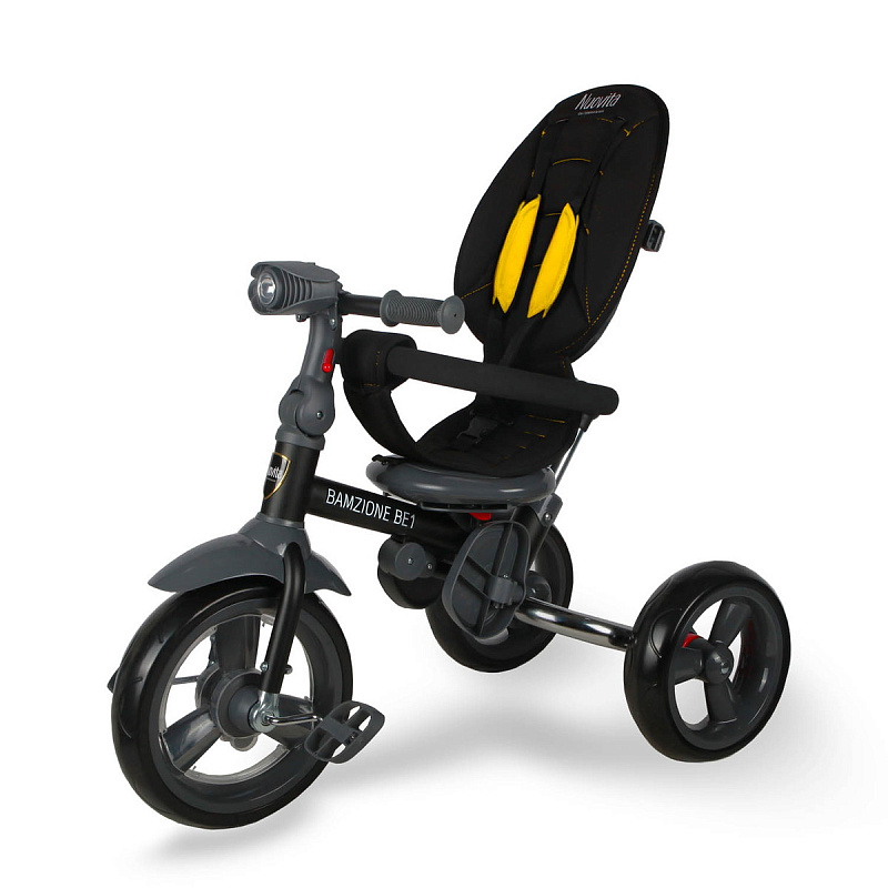 Велосипед трехколесный Nuovita Bamzione BE1 - детский трехколесный велосипед рассчитан на малышей от года до 3-х лет: он имеет адаптивную конструкцию и легко подстраивается под потребности ребенка и его родителей. С помощью ручки-толкателя родители управляют движением, прогулка проходит под полным контролем взрослого, открывая для ребенка новые возможности и расширяя его кругозор. Находясь в полной безопасности, малыш учится самостоятельности - он привыкает крутить педали, быть внимательным и координировать свои действия. Поворотное сиденье позволяет ехать как спиной, так и лицом к родителям: ребенок может держать взрослых в поле зрения или наслаждаться изучением окружающего мира. Высокая спинка, которую можно поставить прямо или полулежа, подножки и мягкий чехол - гарантия того, что длительные прогулки на этом детском трехколесном велосипеде будут комфортны. Капор-тент защищает от ветра и обеспечивает тень в солнечные дни (регулируется в 3-х положениях). Тканевые элементы сделаны из износостойкого материала. При необходимости чехол можно снять для стирки. Детский трехколесный велосипед Bamzione BE1 имеет светомузыкальную панель с имитацией звуков заводимого мотора и шума поездки, что приведет в восторг маленького гонщика.