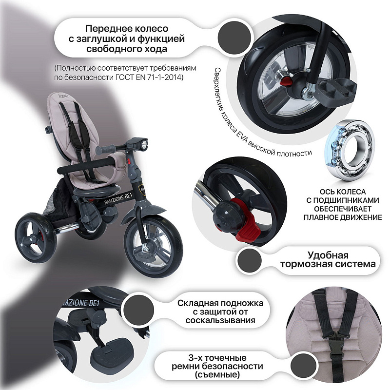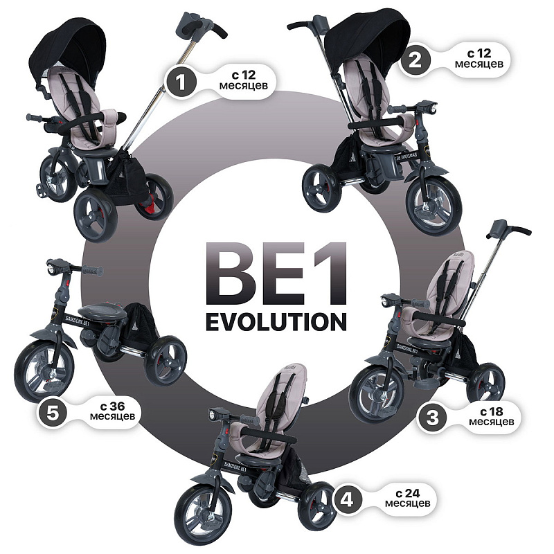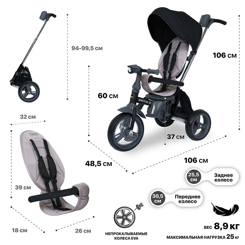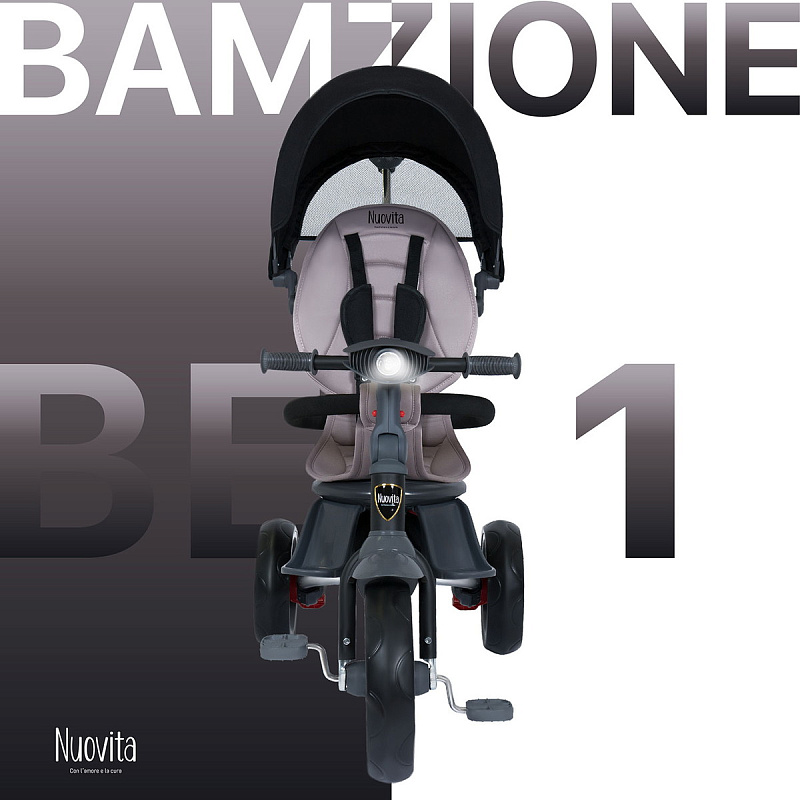 Велосипед трехколесный Nuovita Bamzione BE1 - детский трехколесный велосипед рассчитан на малышей от года до 3-х лет: он имеет адаптивную конструкцию и легко подстраивается под потребности ребенка и его родителей. С помощью ручки-толкателя родители управляют движением, прогулка проходит под полным контролем взрослого, открывая для ребенка новые возможности и расширяя его кругозор. Находясь в полной безопасности, малыш учится самостоятельности - он привыкает крутить педали, быть внимательным и координировать свои действия. Поворотное сиденье позволяет ехать как спиной, так и лицом к родителям: ребенок может держать взрослых в поле зрения или наслаждаться изучением окружающего мира. Высокая спинка, которую можно поставить прямо или полулежа, подножки и мягкий чехол - гарантия того, что длительные прогулки на этом детском трехколесном велосипеде будут комфортны. Капор-тент защищает от ветра и обеспечивает тень в солнечные дни (регулируется в 3-х положениях). Тканевые элементы сделаны из износостойкого материала. При необходимости чехол можно снять для стирки. Детский трехколесный велосипед Bamzione BE1 имеет светомузыкальную панель с имитацией звуков заводимого мотора и шума поездки, что приведет в восторг маленького гонщика.