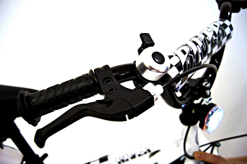 - Руль регулируется по высоте, на нём установлен звонок, светодиодная фара и рукоятки переднего и заднего тормоза.