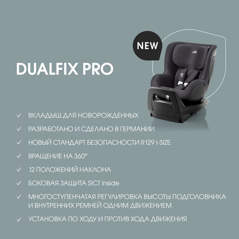 Автокресло Britax Roemer DUALFIX PRO – это уверенность в том, что ваш ребёнок будет в безопасности во время любой поездки. Подходит для детей от рождения до 4-х лет (105 см), может устанавливаться как по ходу, так и против хода движения. А благодаря вращению чаши на 360 ° вам будет легко выполнить посадку и высадку вашего малыша – даже на самой тесной парковке.