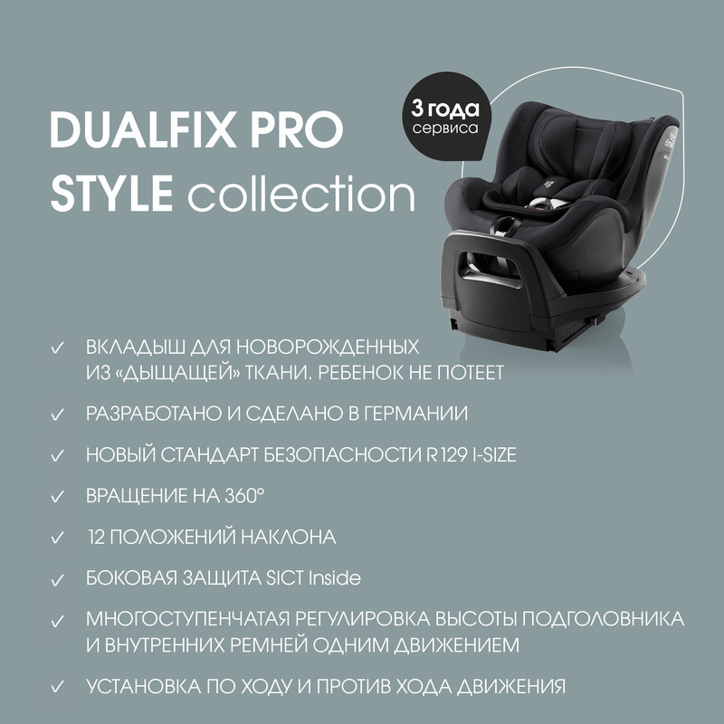 Автокресло Britax Roemer DUALFIX PRO – это уверенность в том, что ваш ребёнок будет в безопасности во время любой поездки. Подходит для детей от рождения до 4-х лет (105 см), может устанавливаться как по ходу, так и против хода движения. А благодаря вращению чаши на 360 ° вам будет легко выполнить посадку и высадку вашего малыша – даже на самой тесной парковке.