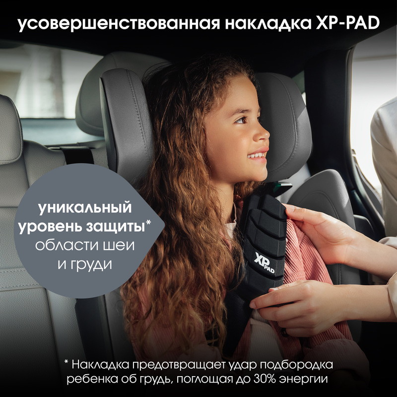 Даже при тщательном планировании и осторожном вождении подготовиться к столкновению невозможно. Компания Britax Roemer разработала специальную накладку XP-Pad из амортизирующей пены для защиты области шеи вашего ребенка при лобовом столкновении. Она предотвращает удар подбородка ребенка об грудь, поглощая до 30%* энергии, а также ограничивает резкое движение головы вперед, что обеспечивает защиту шеи вашего ребенка. В то же время она выполняет роль дополнительной накладки на ремень безопасности.