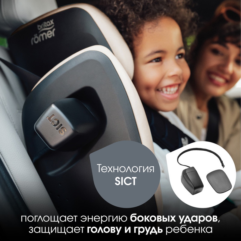 Система SICT обеспечивает максимальную защиту в случае бокового столкновения. Амортизационный элемент уменьшает энергию бокового удара, минимизируя расстояние между автомобилем и автокреслом, а также, сжимаясь, поглощает энергию удара до того, как она подействует на ребенка. Чтобы максимально защитить своего ребенка, достаточно установить систему защиты SICT на стороне, расположенной ближе к двери. SICT уменьшает на 40%* воздействие бокового удара. Благодаря специальному ремню система SICT надежно прикреплена к корпусу автокресла и не потеряется.