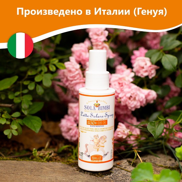 Молочко-спрей для загара из серии Sole Bimbi с ультра сильной защитой SPF 50+, созданное на основе экстрактов цветков календулы.