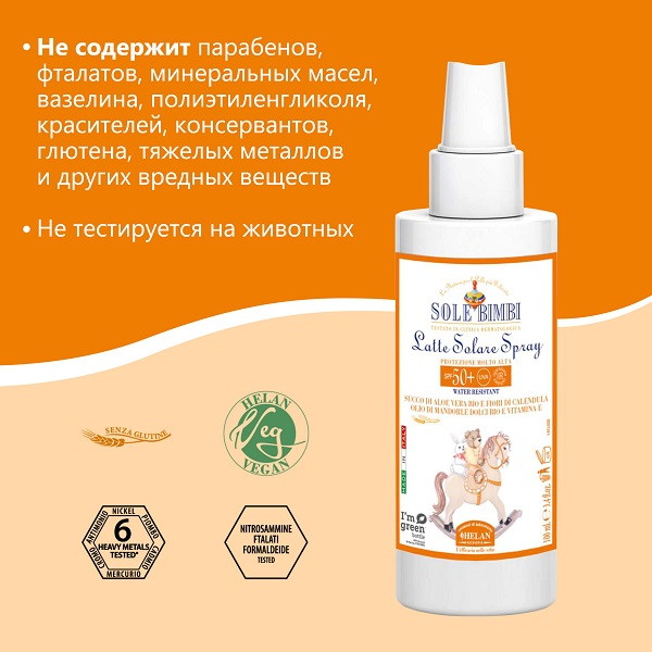 - Солнцезащитное молочко-спрей Helan не содержит SLS, SLES (моющих синтетических веществ), парабенов, минеральное масло, пропиленгликоль, красителей, тяжелых металлов – веществ, которые оказывают канцерогенное и разрушительное воздействие на организм.