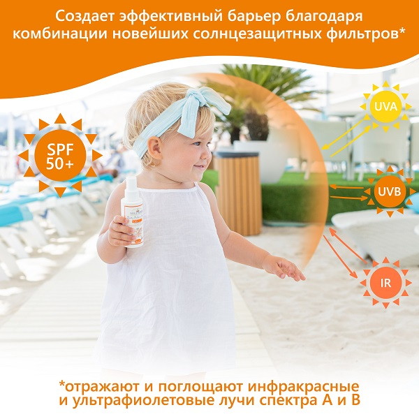Молочко-спрей SPF 50+, благодаря инновационной системе фильтрации, эффективно защищает самую чувствительную кожу, даже новорожденных детей.
