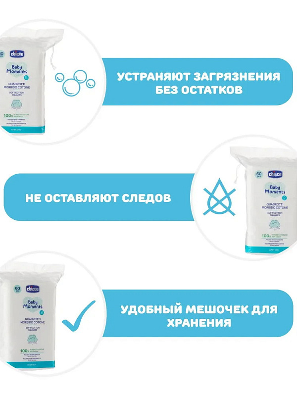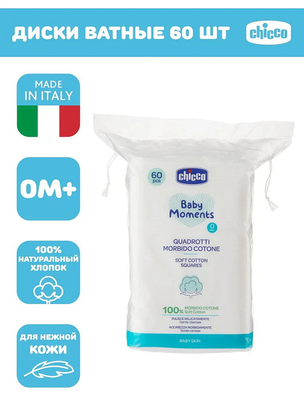 Ватные диски Chicco - специальный ингредиент для каждого этапа смены подгузника, чтобы защитить и успокоить нежную кожу малыша. Хлопчатобумажные диски изготовлены из 100% натурального хлопка, мягко ухаживают за кожей малыша. Они устраняют загрязнения без остатков. Удаляют загрязнения, не оставляя следов. Мешок следует хранить в недоступном для детей месте во избежание риска удушья. Протестировано дерматологически.