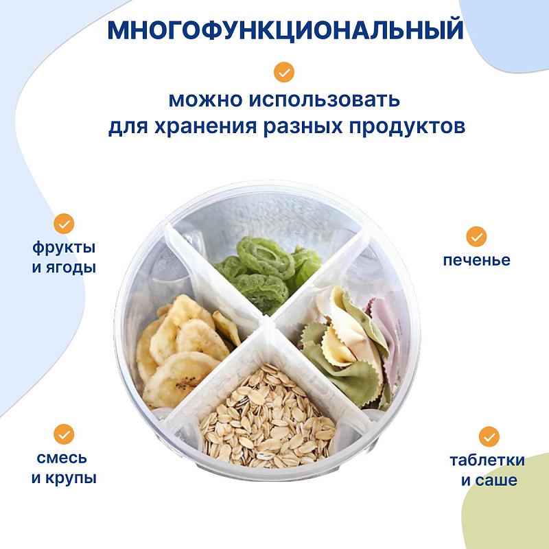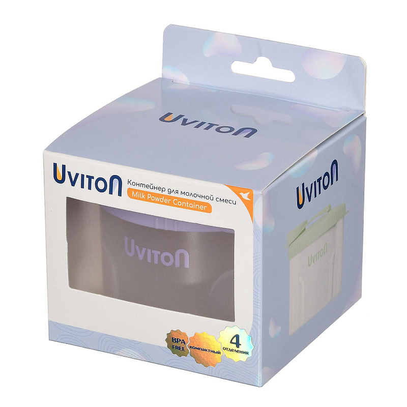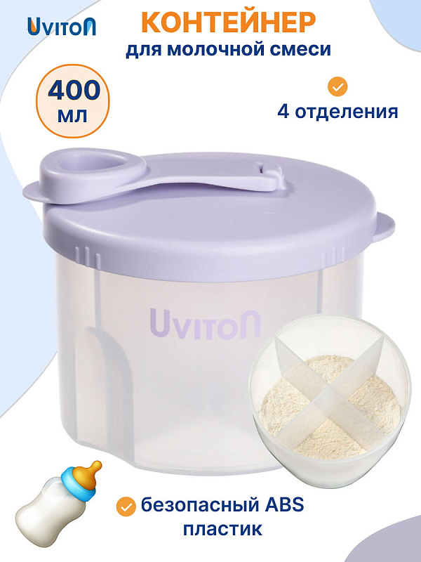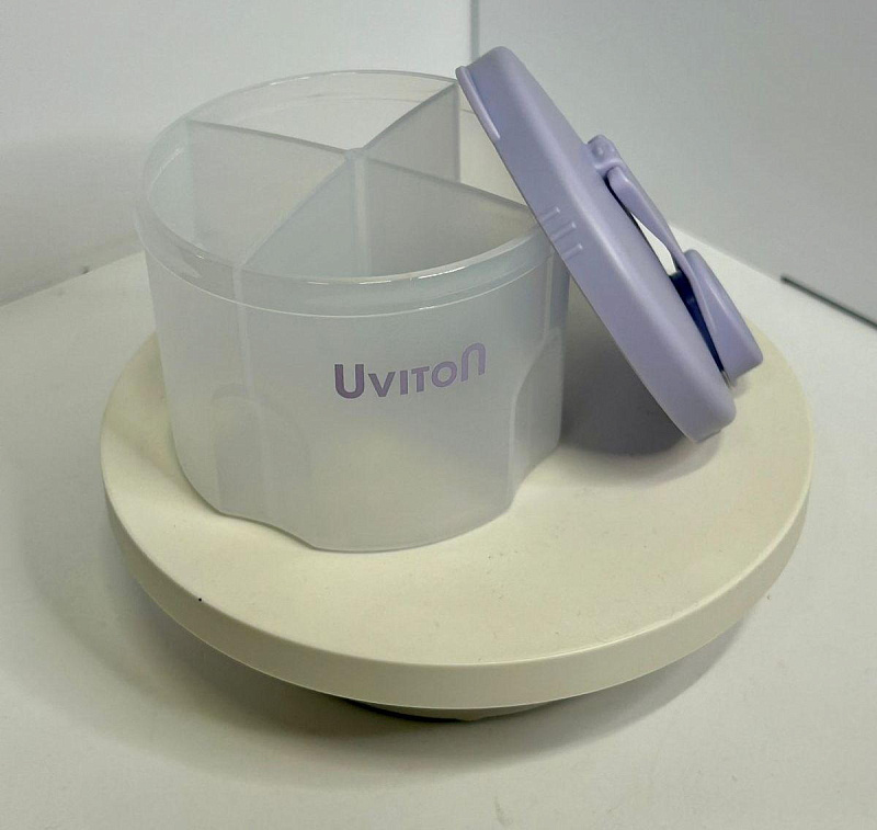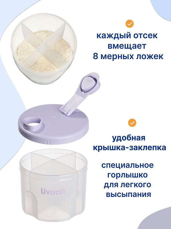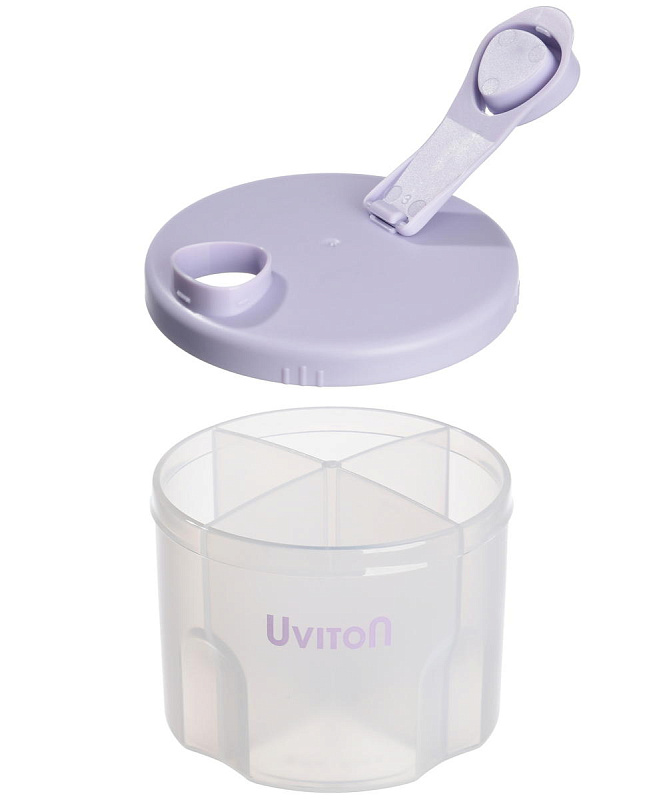 Дозатор для молочной смеси с 4-мя отделениями Uviton. Каждая секция вмещает порцию сухой молочной смеси (8 мерных ложек). Контейнер для смеси новорождённому позволяет заранее отмерять и хранить определённое количество сухой смеси или каши для ребенка.