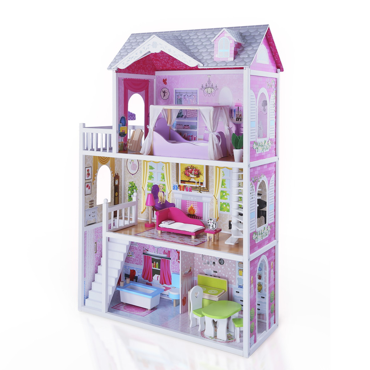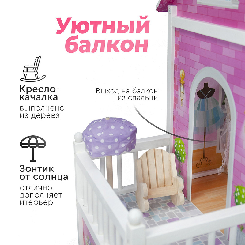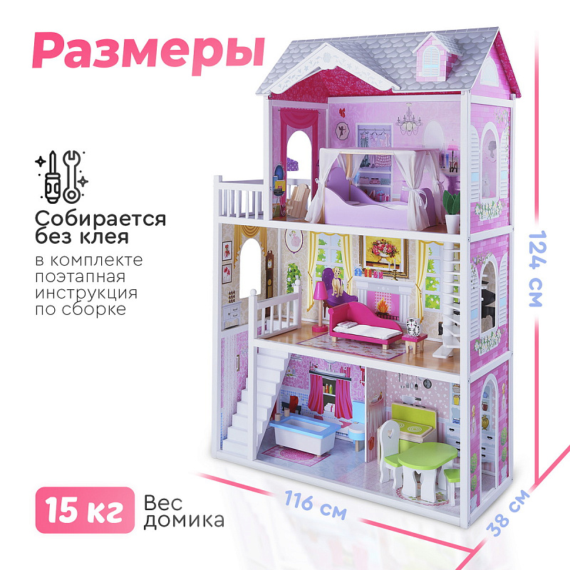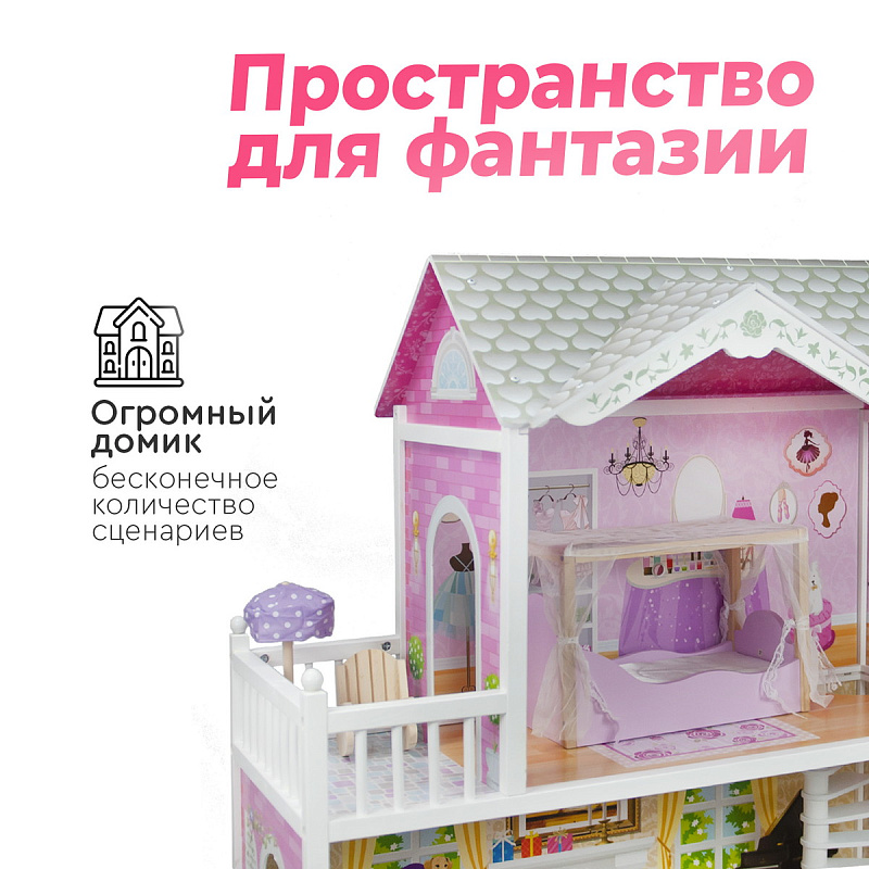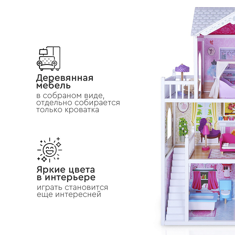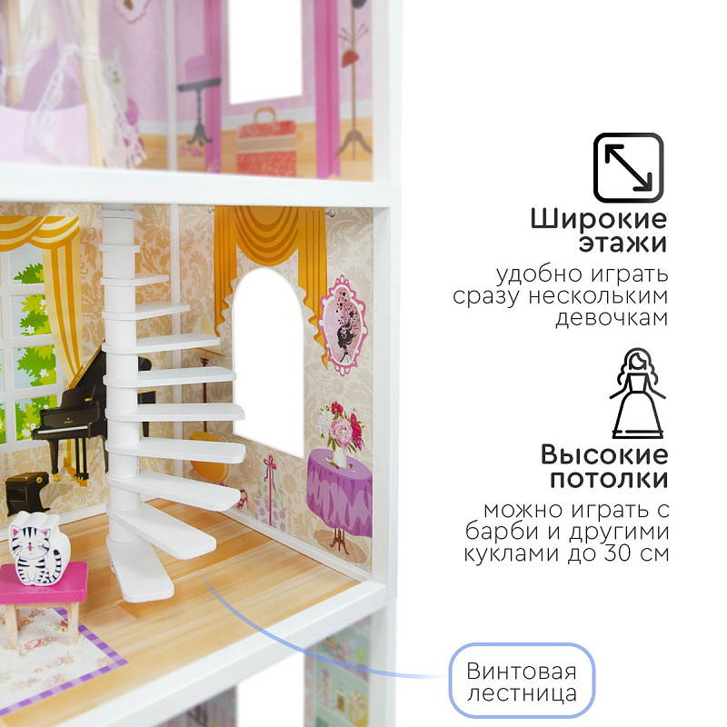 Огромный красочный дом для кукол Tomix Aria – это мечта любой девочки! Дом имеет 3 этажа. На первом расположена кухня и ванная, на втором этаже располагается уютная гостиная с камином и красивыми окнами, на третий этаж ведет необычная винтовая лестница, которая приводит в изящную спальню с выходом на балкон. Дом оснащен множеством предметов мебели и интерьера, которые сделают игру максимально реалистичной. Размер домика позволяет играть вместе нескольким девочкам. Для игры подойдут любые куклы до 30 см.