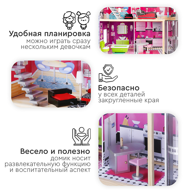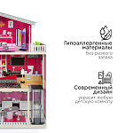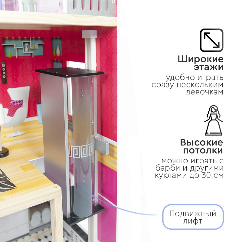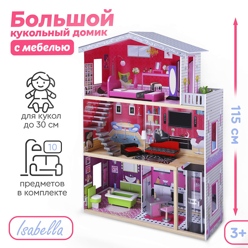 Стильный и современный дом для кукол Tomix Isabella – это мечта любой девочки! Дом имеет 3 этажа. На первом расположена просторная кухня и ванная комната, на втором этаже - уютная гостиная, ну а третий этаж занимает изысканная спальня с выходом на балкон. Изюминка дома – лифт, на котором можно подниматься из кухни в гостиную! Дом оснащен множеством предметов мебели и интерьера, которые сделают игру максимально реалистичной. Размер домика позволяет играть вместе нескольким девочкам. Для игры подойдут любые куклы до 30 см.