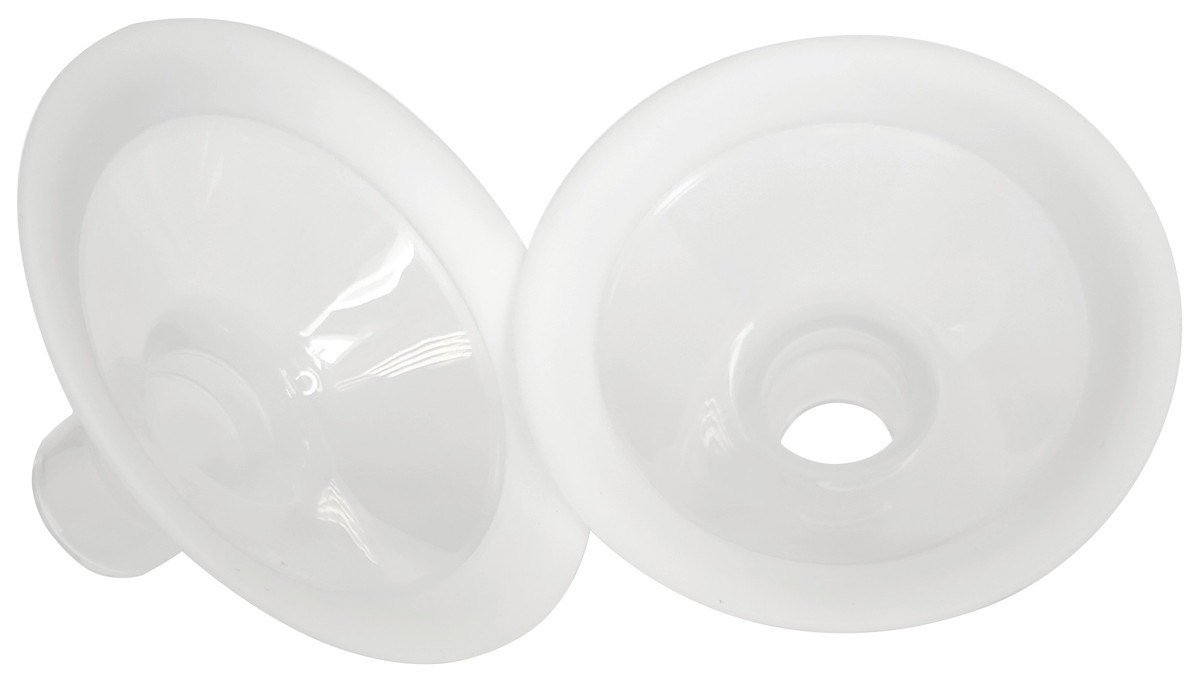 Две дополнительные воронки-насадки диаметром 27 мм для молокоотсоса SE450. Используются для обеспечения большего комфорта при сцеживании грудного молока, подбираются индивидуально в зависимости от диаметра соска. Сосок (не путать с ареолой) должен свободно входить в отверстие, расположенное в основании воронки. При этом отверстие не должно быть намного больше соска и наоборот, отверстие не должно быть слишком узким.