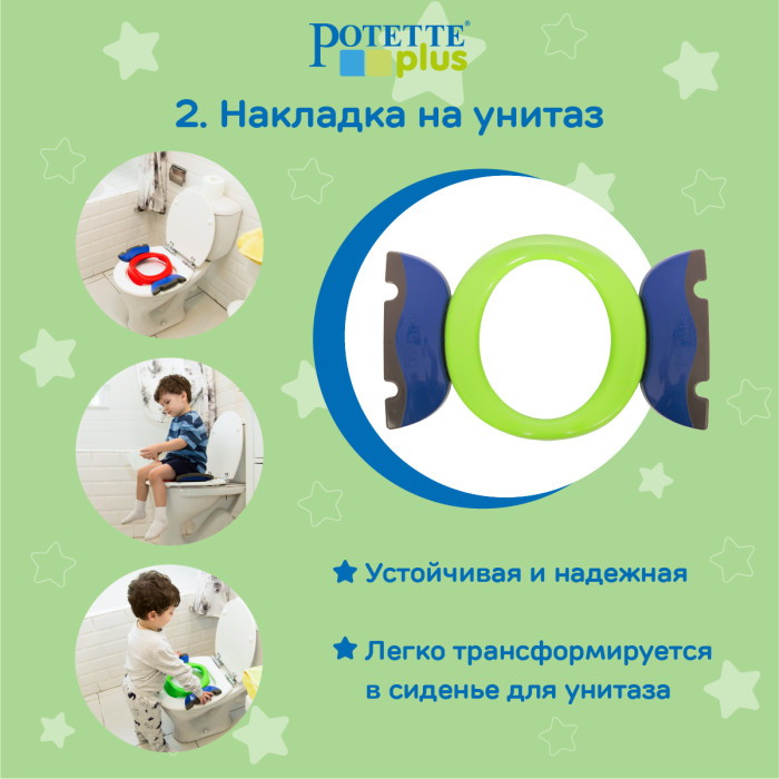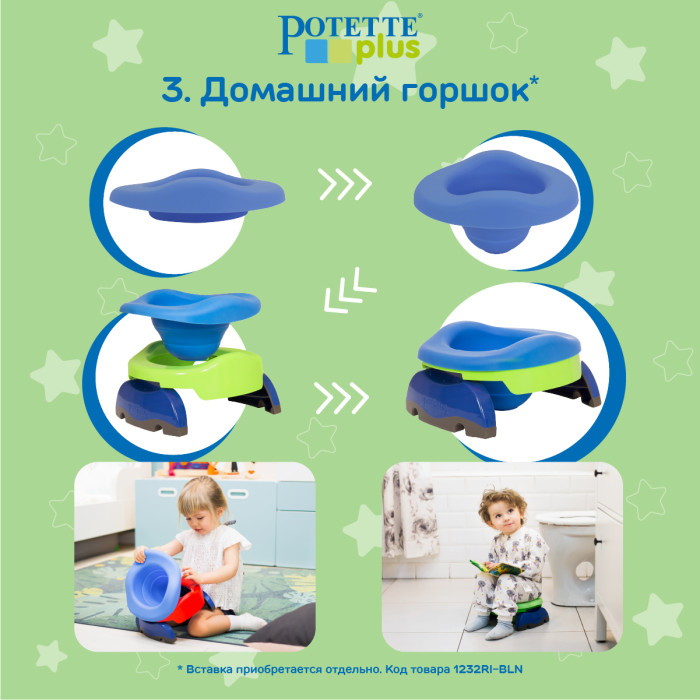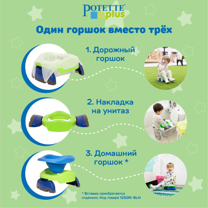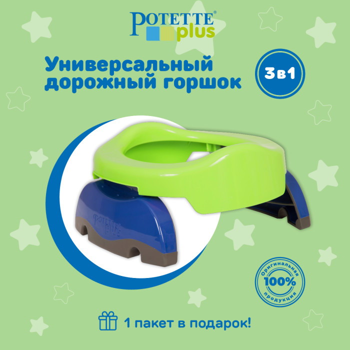 Горшок дорожный складной Potette представляет собой универсальный аксессуар 2 в 1 и выполняет две функции: дорожного горшка и ободка на унитаз. Если отдельно купить силиконовую вкладку, то его можно трансформировать в горшок 3 в 1, который можно использовать и в качестве домашнего горшка.