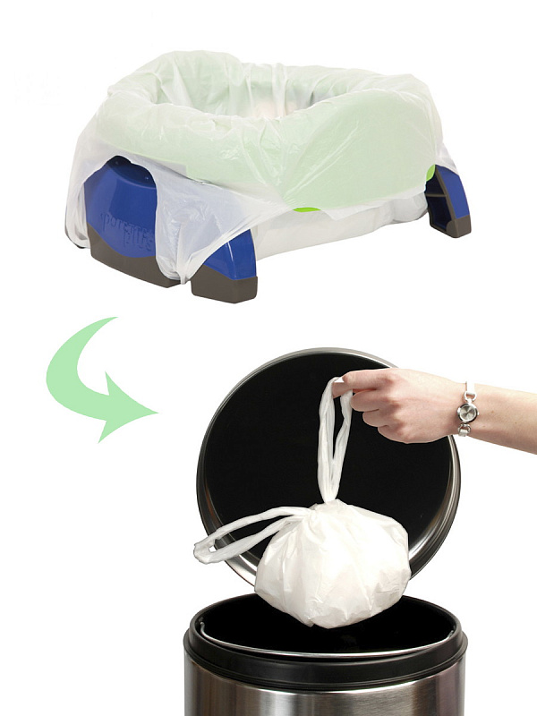 Установить на верхнюю часть специальный пакет, который идет в комплекте с горшком. Чтобы избежать неприятных сюрпризов (например, соскальзывания наполненного пакета), зацепите его за специальные выемки в нижней части ножек.