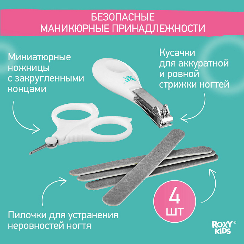 Набор для ухода за новорожденным от ROXY-KIDS за грудничком с первых дней жизни. Его можно компактно хранить в футляре и брать куда угодно. В наборе есть щетка для волос с натуральной щетиной, расческа, маникюрные ножницы, щипчики для ногтей, 4 пилочки, зубная щетка. Массажная щетка подходит для вычесывания себорейных чешуек из волос младенца. Она улучшает кровообращение кожи головы и стимулирует волосяные луковицы, ускоряя рост первых волос малыша. Расческа с закругленными зубцами не царапает нежную кожу головы и обеспечит массажный эффект. Ножницы с закругленными тонкими лезвиями, щипчики из нержавеющей стали и пилочки безопасны и сделаны специально для мягких и маленьких ноготков новорожденных. Подстригайте ноготки, когда они отрастают на 1 мм, иначе малыш может себя поцарапать. Миниатюрная зубная щетка из деликатного нейлона поможет ухаживать за самыми первыми зубами и снять зуд при прорезывании.