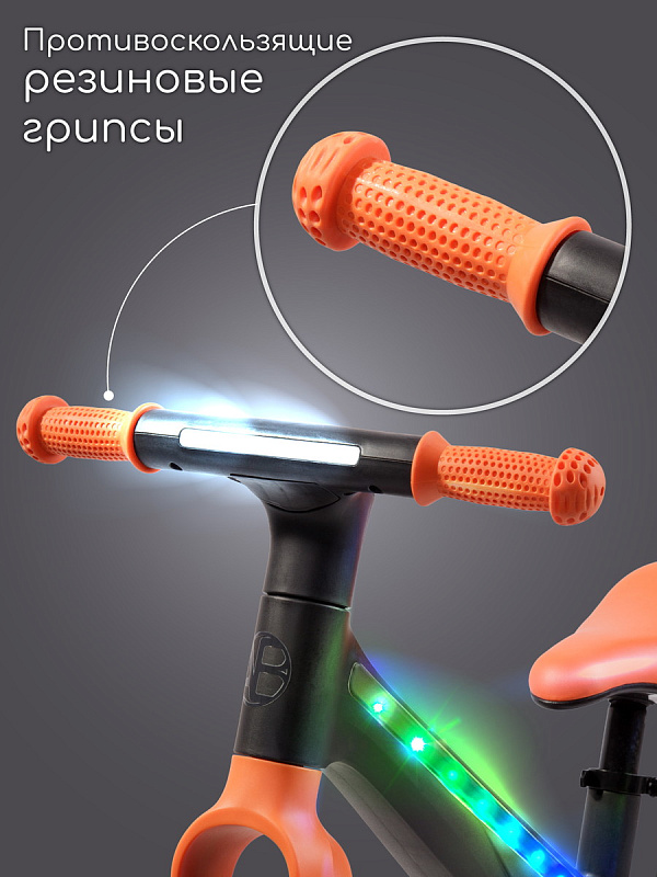 На руле у детского беговела также предусмотрен фонарик. Благодаря надувным колесам велобег обеспечивает плавный ход, а ударопрочная нейлоновая рама гарантирует долговечность и безопасность. Противоскользящие грипсы для надежного хвата. Удобные выемки-подножки для ног для максимального комфорта. Эргономичное седло из эко-кожи, которое всегда останется комфортным. Сиденье регулируется по высоте, подстраиваясь под стремительный рост вашего ребенка. Максимальная нагрузка 50 кг.