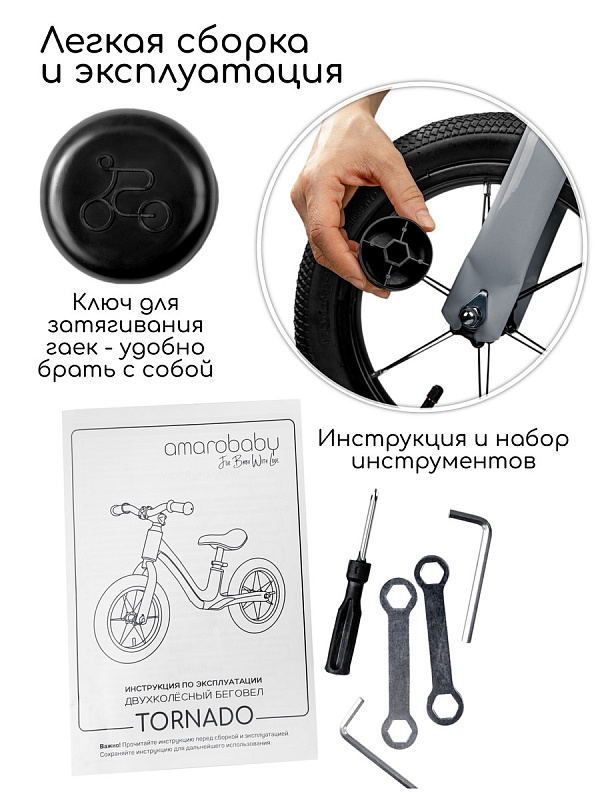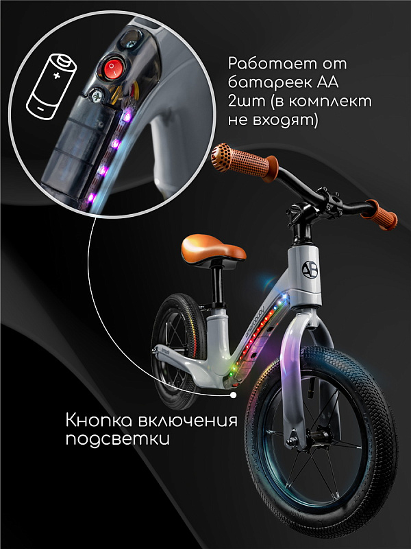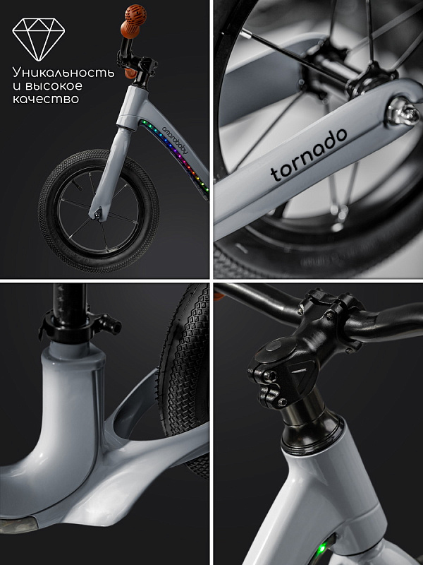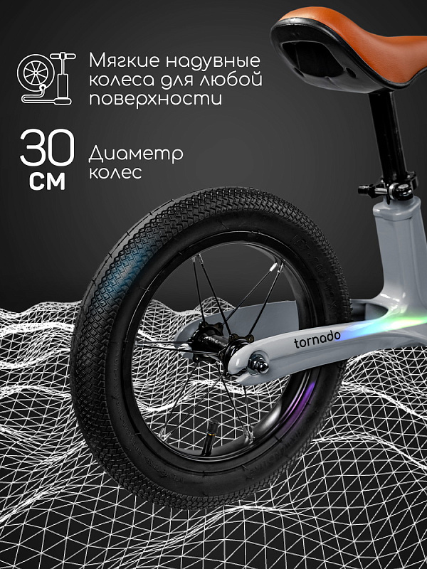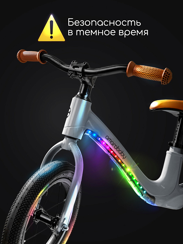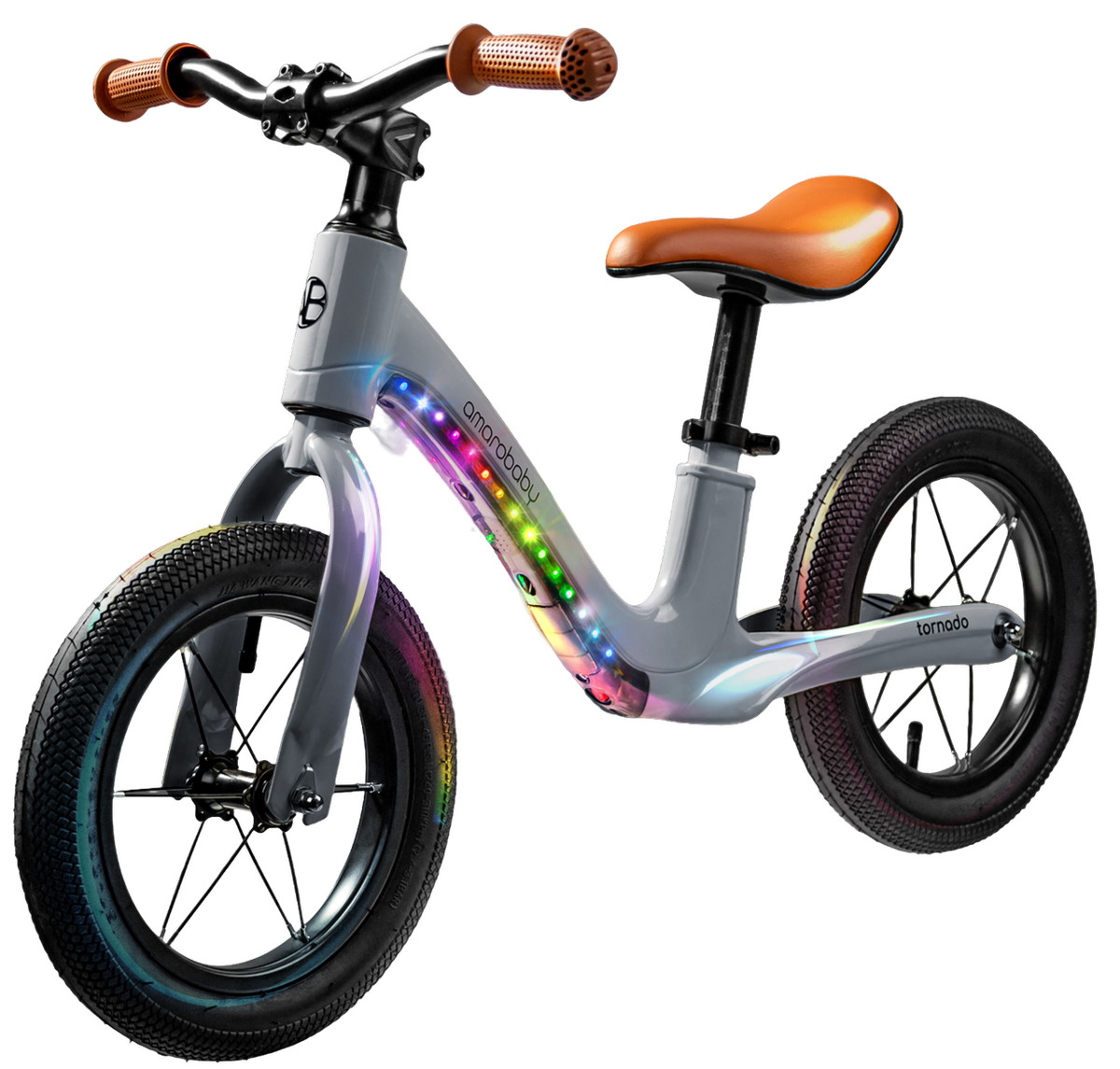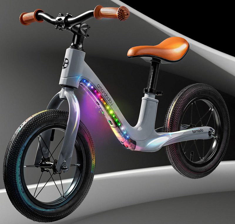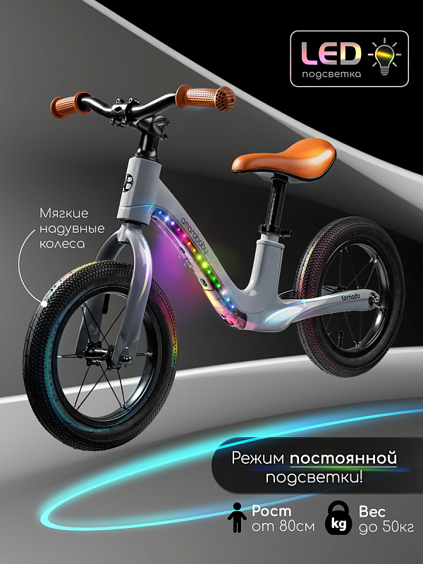 Беговел AmaroBaby Tornado - замечательный способ ярко и с удовольствием провести время на прогулки для вашего ребенка. Подходит для детей ростом от 80 до 100 см и весом до 50 кг. Анатомическое сиденье с регулировкой по высоте подарить дополнительный комфорт и позволит индивидуально отрегулировать беговел под вашего малыша. Модель позволит научится вашему ребенку держать равновесие и баланс, подготовит к езде на велосипеде и поможет развить координацию движений. Стильный дизайн с яркой подсветкой рамы позволит ребенку выделятся среди сверстников и оставаться заметным даже в темное время суток. Легкий вес, удобные противоскользящие грипсы и сидение из эко кожи станут дополнительными преимуществами при выборе данной модели, а надувные колеса обеспечат хорошую амортизацию (для подкачки колес вам понадобится любой велосипедный насос) и дополнительную безопасность. Велобег имеет руль, который вращается на 360 градусов, что позволяет ребенку легко маневрировать и управлять им во время езды.