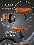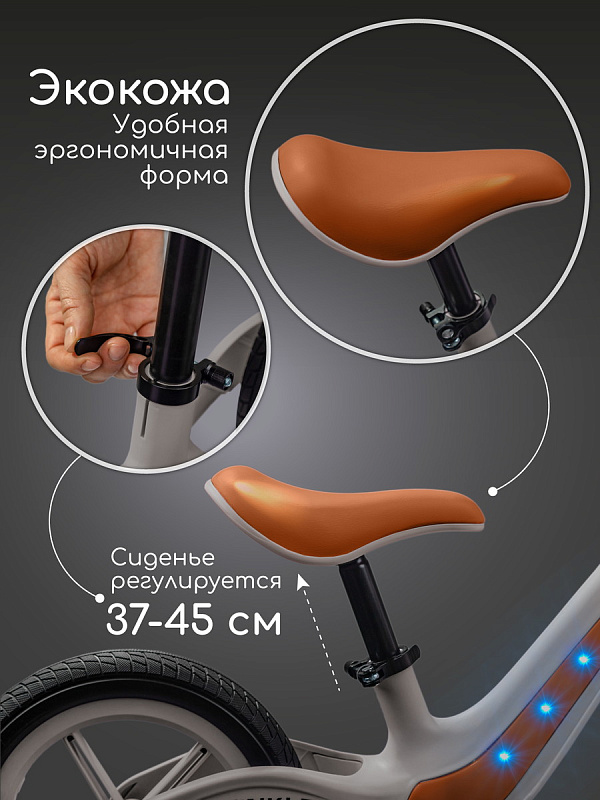 Эргономичное сиденье выполнено из эко кожи. Под сиденьем удобная выемка, чтобы была возможность переносить беговел. На раме присутствуют специальные подножки, чтобы ребенку было комфортно.