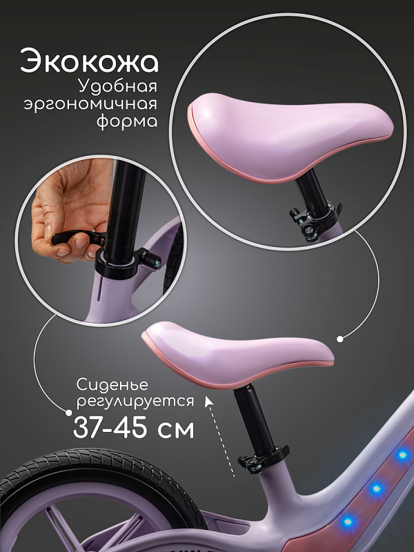 Эргономичное сиденье выполнено из эко кожи. Под сиденьем удобная выемка, чтобы была возможность переносить беговел. На раме присутствуют специальные подножки, чтобы ребенку было комфортно.