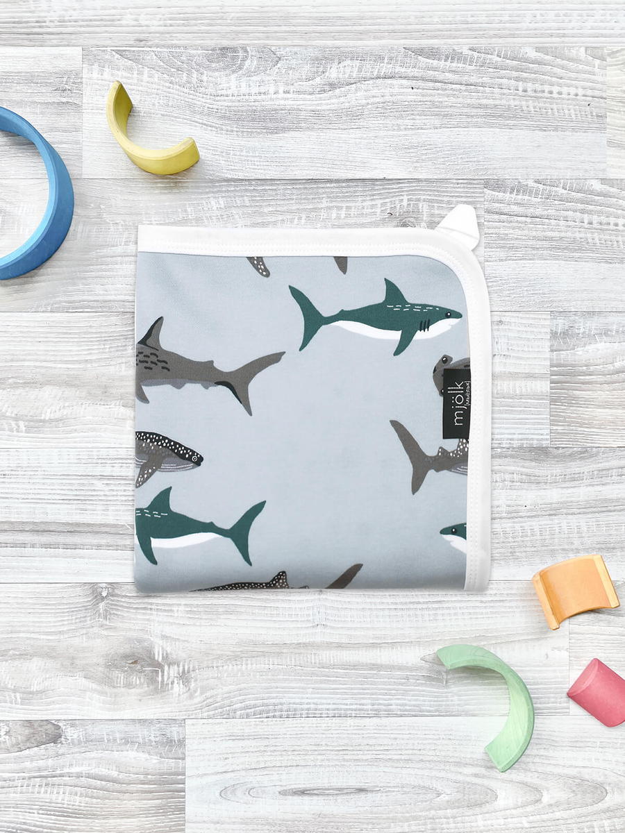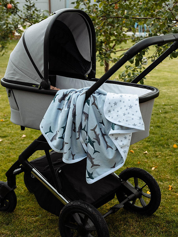Двусторонний плед Mjölk [мьёльк] Акулы выполнен из двух слоёв трикотажного 100% хлопка без наполнителя. Материал нежный и мягкий, дышит, не вызывает аллергии и дарит ребёнку уют. Плед можно использовать для сна в кроватке, коляске и автокресле, как накидку для кормления. Яркий принт делает его отличным фоном для фотосессий в домашних условиях или на улице. Изделие хорошо сочетается с шапочками, комбинезонами и пелёнками в тон.