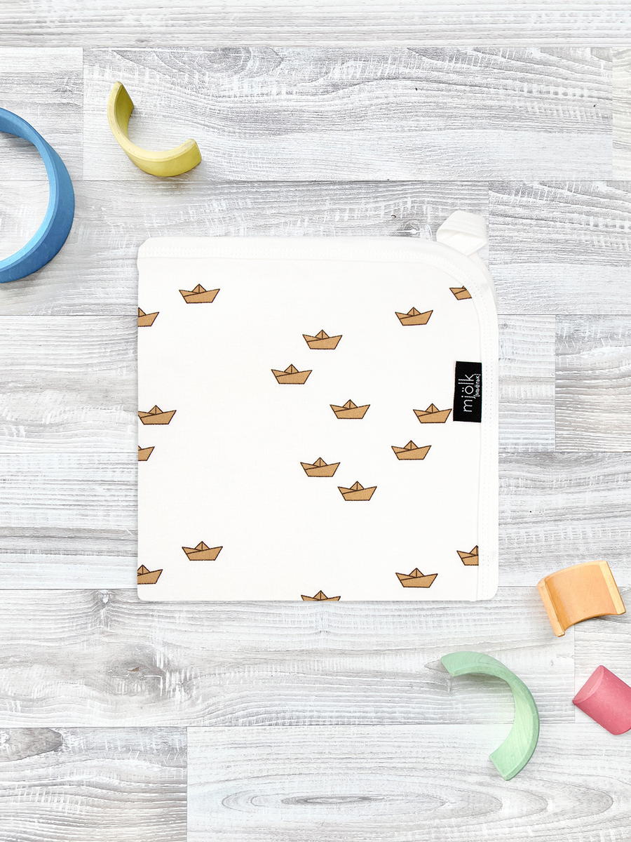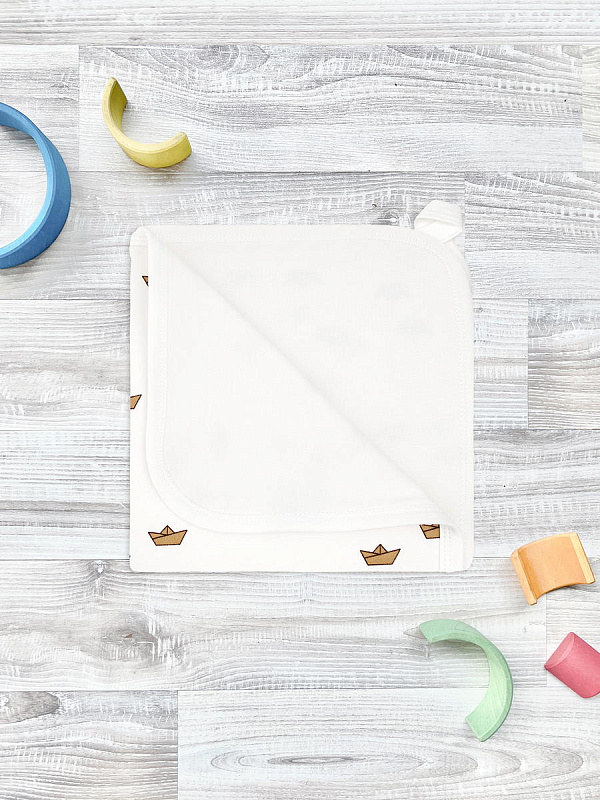 Двусторонний плед Mjölk [мьёльк] Бумажные кораблики выполнен из двух слоёв трикотажного 100% хлопка без наполнителя. Материал нежный и мягкий, дышит, не вызывает аллергии и дарит ребёнку уют. Плед можно использовать для сна в кроватке, коляске и автокресле, как накидку для кормления. Яркий принт делает его отличным фоном для фотосессий в домашних условиях или на улице. Изделие хорошо сочетается с шапочками, комбинезонами и пелёнками в тон.