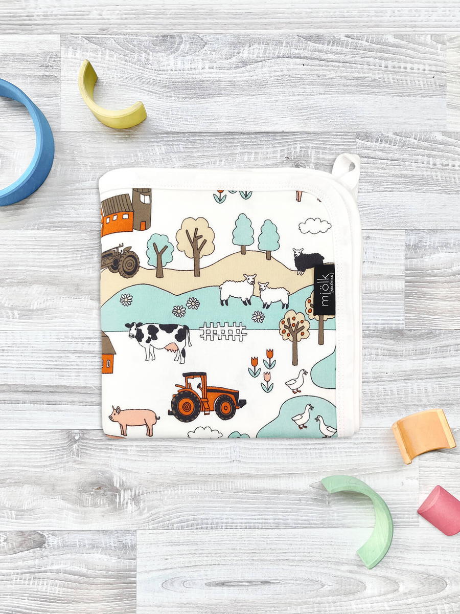 Плед изготовлен из трикотажного хлопка под названием интерлок. Интерлок – это плотный трикотаж двойного плетения хлопчатобумажных нитей. Изделия из такого материала практически не мнутся, хорошо сохраняют цвет и форму. Принт с милыми поросятами, овечками, коровами и гусями подойдёт мальчикам и девочкам. Плюсы материала: