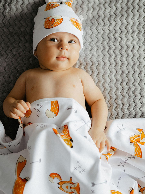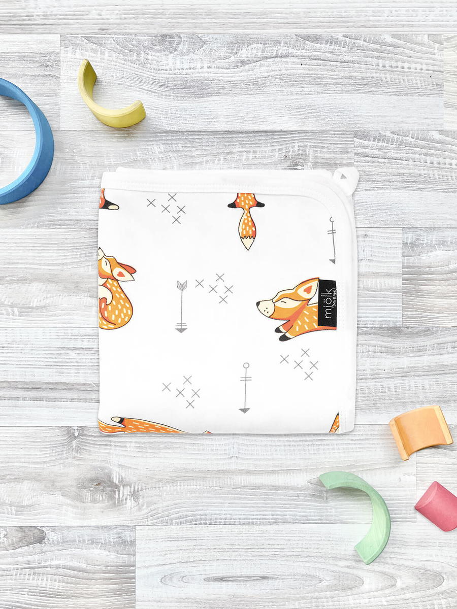 Двусторонний плед Mjölk [мьёльк] Лисички выполнен из двух слоёв трикотажного 100% хлопка без наполнителя. На одной стороне пледа расположился нарядный рисунок из оранжевых лисичек, а на второй – россыпь серебристо-серых звёздочек разного размера на белом фоне. Материал нежный и мягкий, «дышит», не вызывает аллергии и дарит ребёнку уют. Плед можно использовать для сна в кроватке, коляске и автокресле, как накидку для кормления. Яркий принт делает его отличным фоном для фотосессий в домашних условиях или на улице. Изделие может быть выполнено из ткани разных тонов белого и кремового цвета.