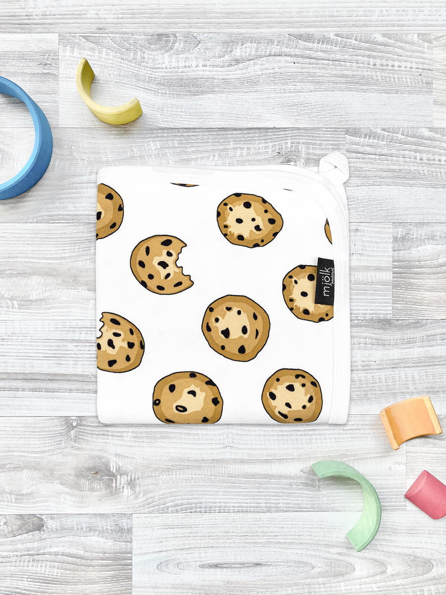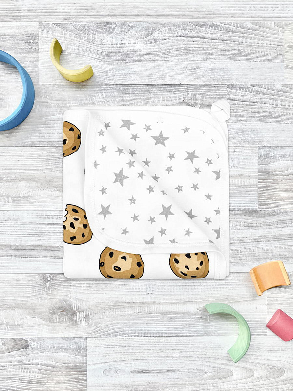 Двусторонний плед Mjölk [мьёльк] Печенье выполнен из двух слоёв трикотажного 100% хлопка без наполнителя. На одной стороне пледа расположился рисунок из аппетитного печенья с шоколадной крошкой, а на второй – россыпь серебристо-серых звёздочек на белом фоне. Материал нежный и мягкий, «дышит», не вызывает аллергии и дарит ребёнку уют. Плед можно использовать для сна в кроватке, коляске и автокресле, как накидку для кормления. Яркий принт делает его отличным фоном для фотосессий в домашних условиях или на улице.