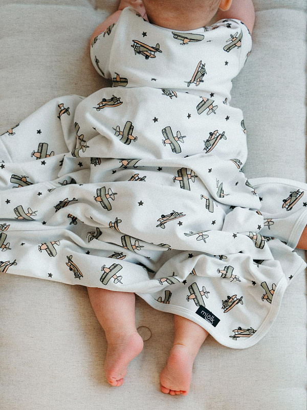 Двусторонний плед Mjölk [мьёльк] Самолёты выполнен из двух слоёв трикотажного 100% хлопка без наполнителя. Материал нежный и мягкий, дышит, не вызывает аллергии и дарит ребёнку уют. Плед можно использовать для сна в кроватке, коляске и автокресле, как накидку для кормления. Яркий принт делает его отличным фоном для фотосессий в домашних условиях или на улице. Изделие хорошо сочетается с шапочками, комбинезонами и пелёнками в тон.