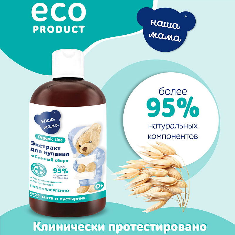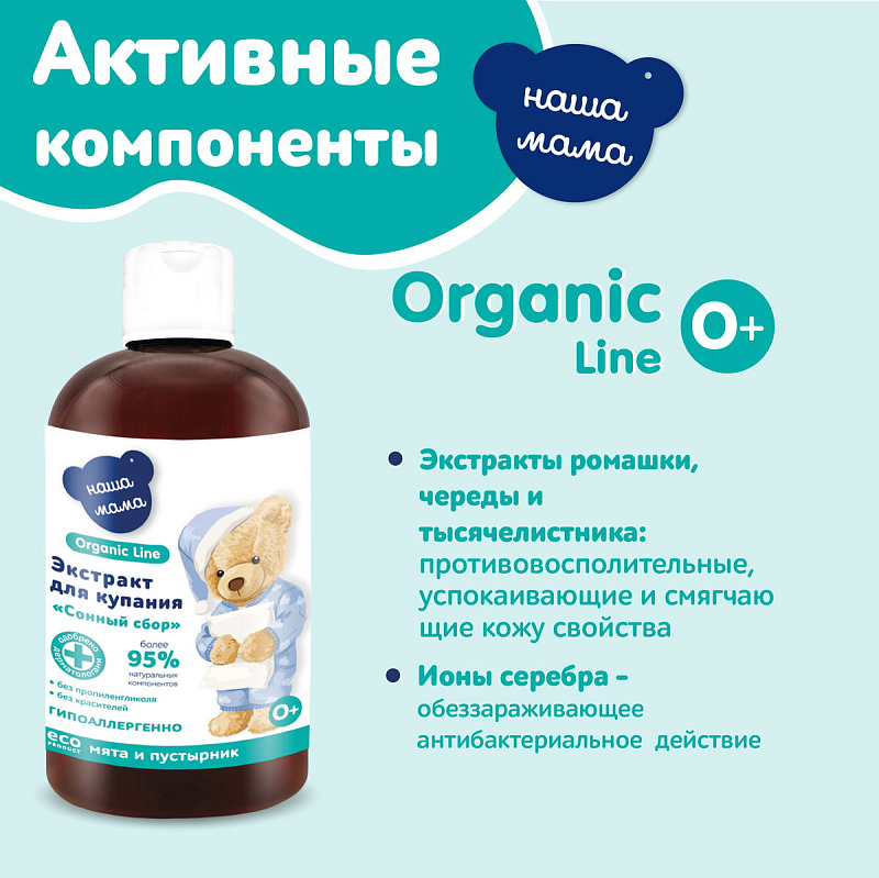 Специальная органическая Эко-Формула высокоэффективного средства нового поколения "Натуральный комплекс экстрактов трав мяты и пустырника для купания младенцев "Баю-бай" серии "Наша мама Organic Line", более действенна, чем другие аналогичные средства для купания, т.к. её состав насыщен высоким содержанием натуральных активных веществ. В комплекс для купания младенцев входят отвары трав пустырника, мяты и ромашки, оказывающие расслабляющее, успокаивающее действие. Состав обладает противовоспалительным и смягчающими свойствами, может применяться с рождения для купания малышей с чувствительной и проблемной кожей, поможет малышам быстро заснуть и поддержать крепкий и здоровый сон. Отвар приготовлен по специальной технологии, на воде, обогащенной ионами серебра, которая обладает мощным обеззараживающим свойством. В состав экстракта входят отвары натуральных трав ромашки, череды и тысячелистника, обладающие противовоспалительными, успокаивающими и смягчающими свойствами. По результатам клинических испытаний "Натуральный комплекс экстрактов трав ромашки, череды и тысячелистника для купания младенцев", показал высокую эффективность и безопасность, рекомендован педиатрами для ежедневных гигиенических процедур у детей с рождения.