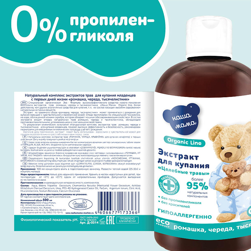 Экстракт трав Наша мама Organic Line для купания младенцев Целебные травы (ромашка, череда, тысячелистник), 500 млНет оценокХарактеристики