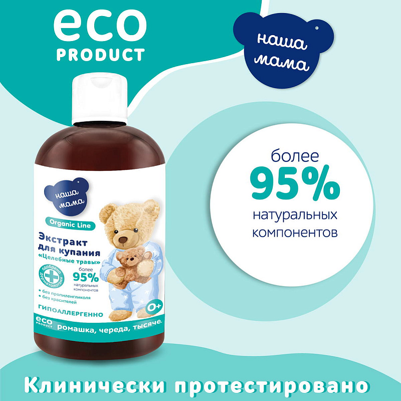 Специальная органическая Эко-Формула высокоэффективного средства нового поколения "Натуральный комплекс экстрактов трав ромашки, череды и тысячелистника "Целебные травы" серии "Наша мама Organic Line", более действенна, чем другие аналогичные средства для купания, т.к. её состав насыщен высоким содержанием натуральных активных веществ. Экстракт травяного сбора из ромашки, череды и тысячелистника может применяться с рождения для купания малышей с чувствительной и проблемной кожей. Отвар приготовлен по специальной технологии, на воде, обогащенной ионами серебра, которая обладает мощным обеззараживающим свойством. В состав экстракта входят отвары натуральных трав ромашки, череды и тысячелистника, обладающие противовоспалительными, успокаивающими и смягчающими свойствами. По результатам клинических испытаний "Натуральный комплекс экстрактов трав ромашки, череды и тысячелистника для купания младенцев", показал высокую эффективность и безопасность, рекомендован педиатрами для ежедневных гигиенических процедур у детей с рождения.
