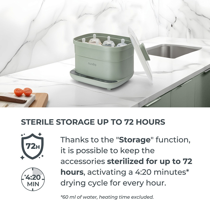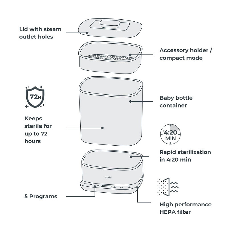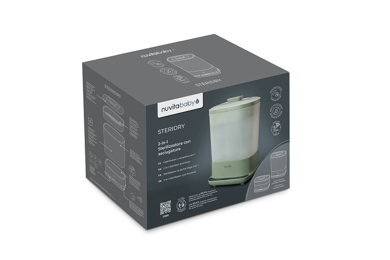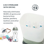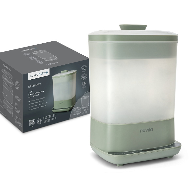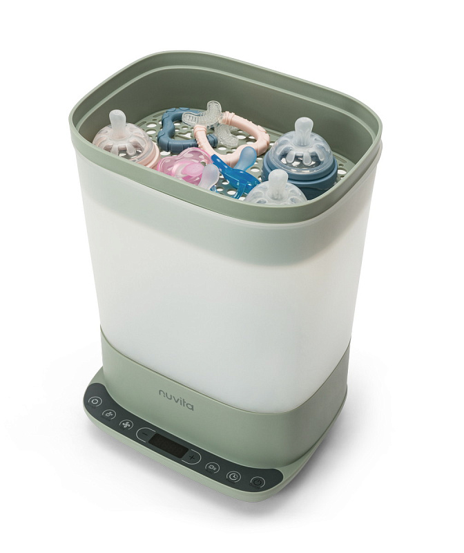 Электрический стерилизатор SteriDry от Nuvita устраняет 99,99% микробов и бактерий благодаря высокотемпературной стерилизации паром.