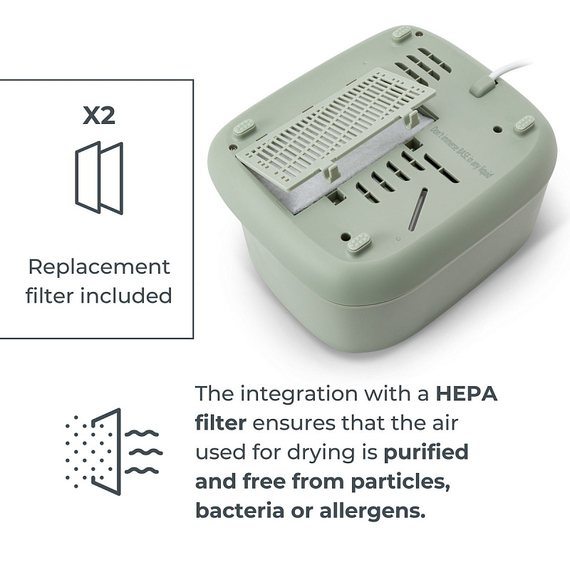 - Сушка очищенным воздухом, не содержащим бактерий или аллергенов, благодаря встроенному фильтру HEPA.