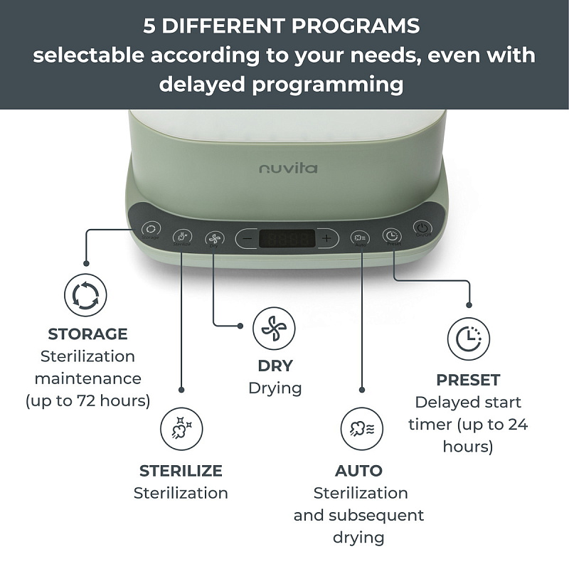 - 5 программ на выбор: стерилизация + сушка, только стерилизация (4, 20 мин), только сушка, стерильное хранение, отложенный запуск до 24 часов.