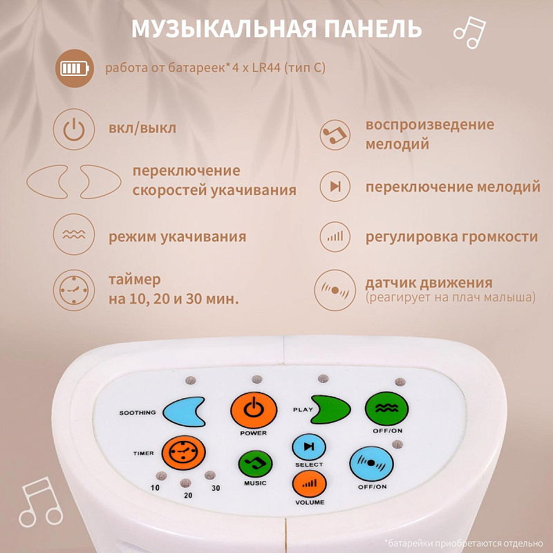 - Качель удобна в управлении. Оснащена таймером. Может работать, как от сети, так и от батареек.