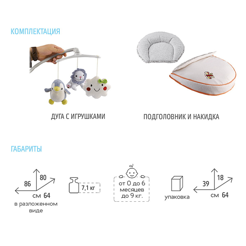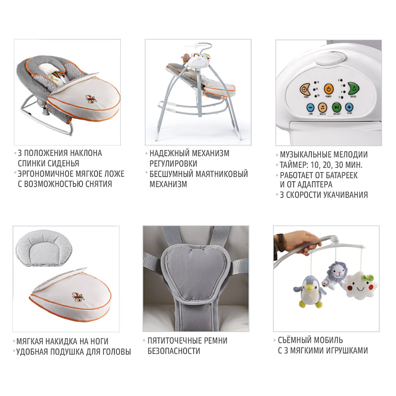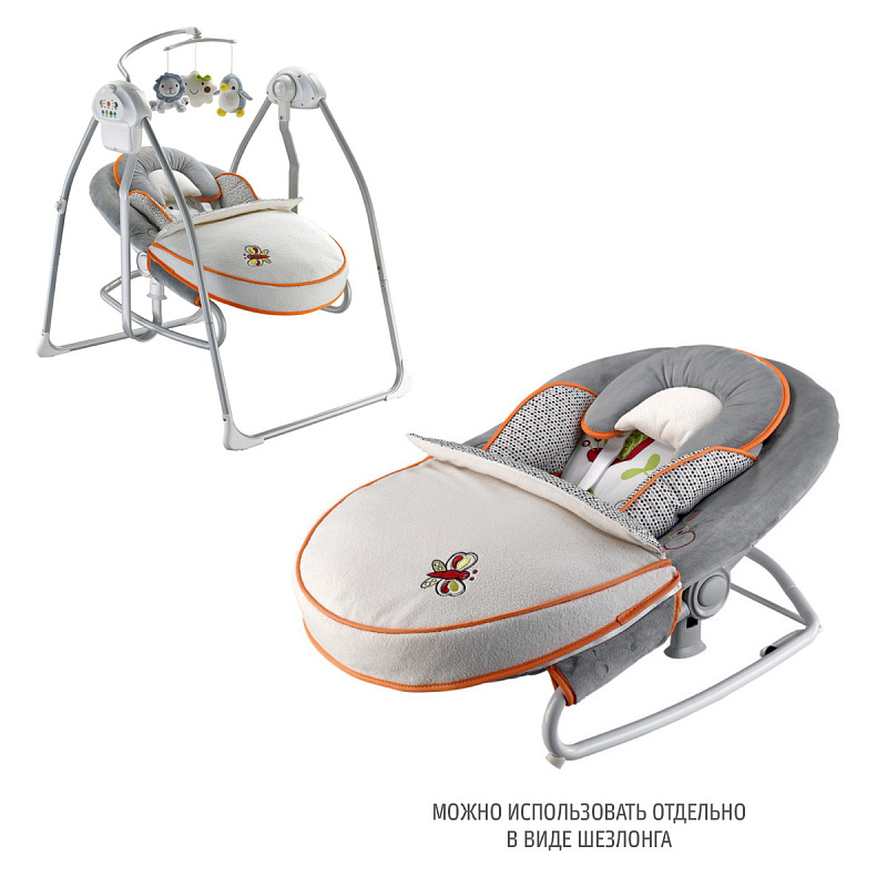 - Все это сделает пребывание младенца в электрокачелях приятным, беззаботным и безопасным: он с удовольствием будет дремать под аккомпанемент убаюкивающих мелодий или, напротив, увлеченно познавать окружающий мир, протягивая ручки к висящим над ним игрушкам.