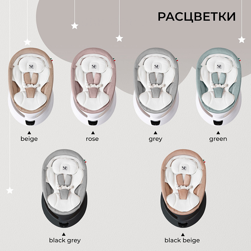 - 5 скоростей укачивания. Пятискоростной режим укачивания подстроится под личные особенности каждого младенца