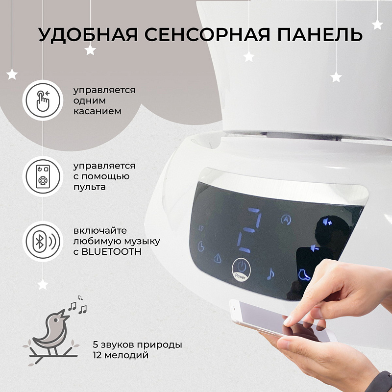 - 12 мелодий и 5 звуков природы. Порадуйте своего малыша веселой песенкой, пением птиц или успокаивающим шумом моря.